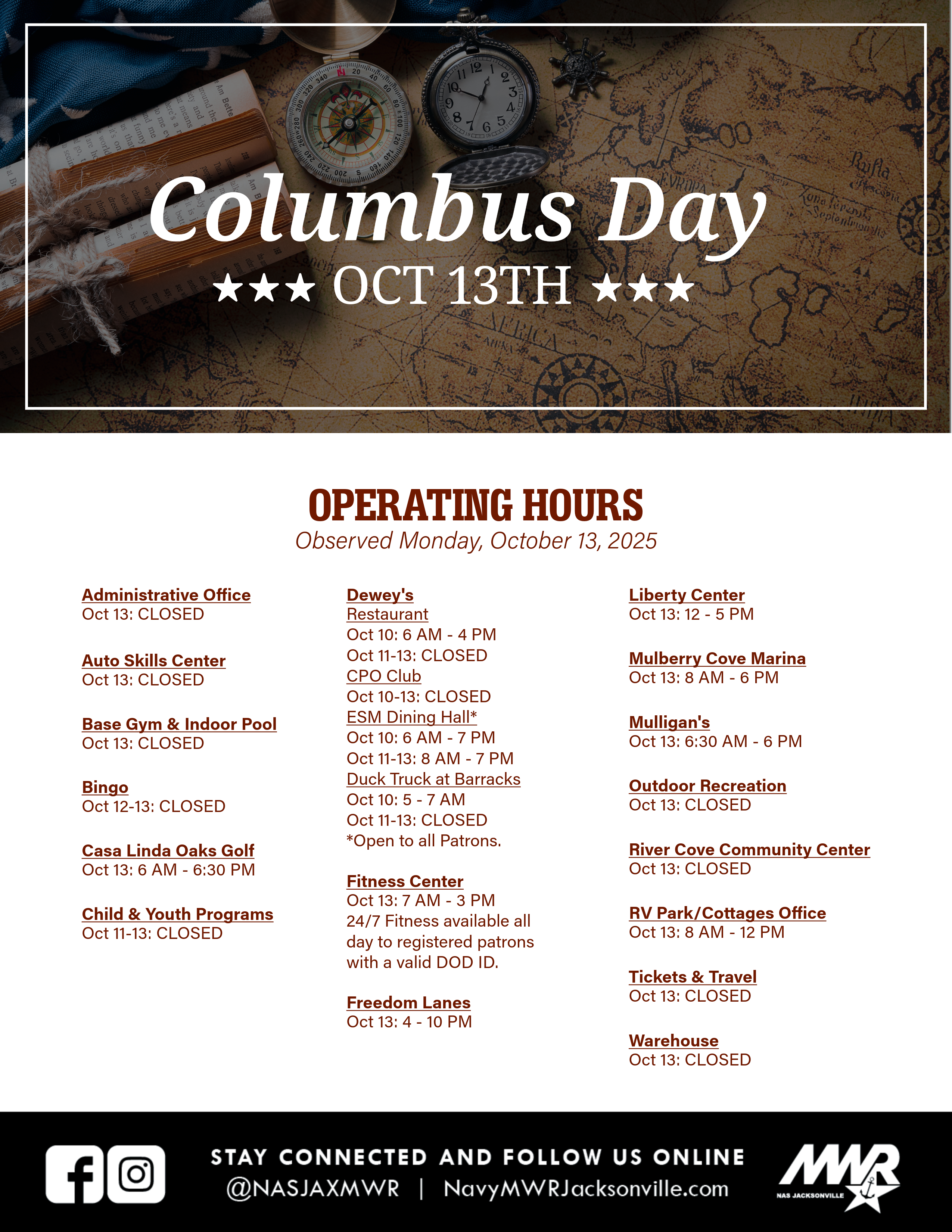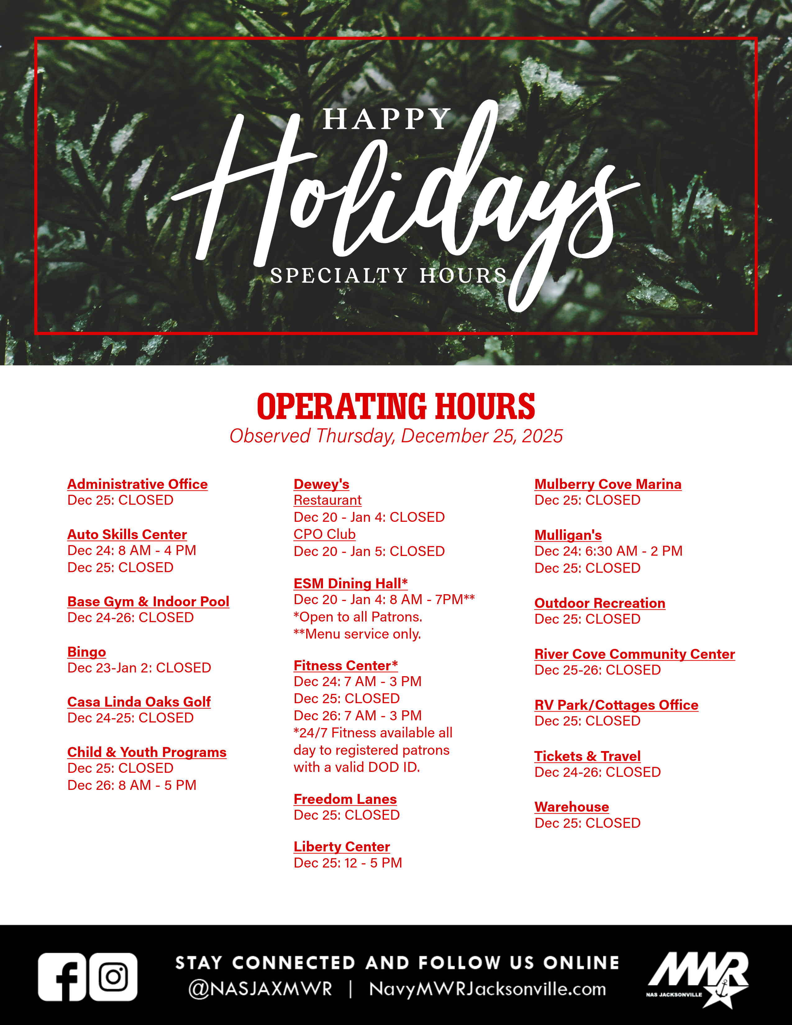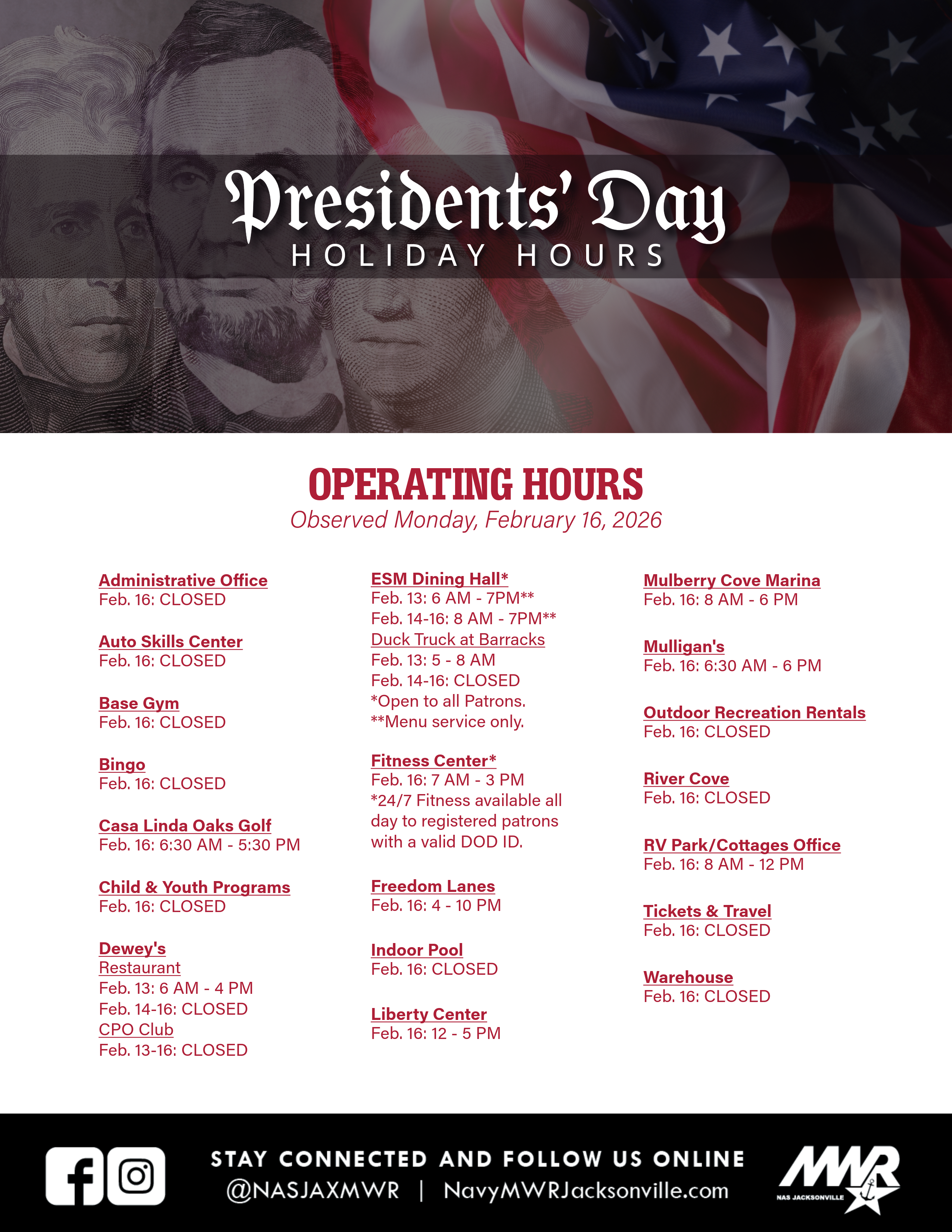 Please click on the files below to see the consolidated list of MWR facility hours. Please note that hours are subject to change and could be affected by federal holidays and/or severe weather events. Upcoming holiday closures are also listed below for your convenience.