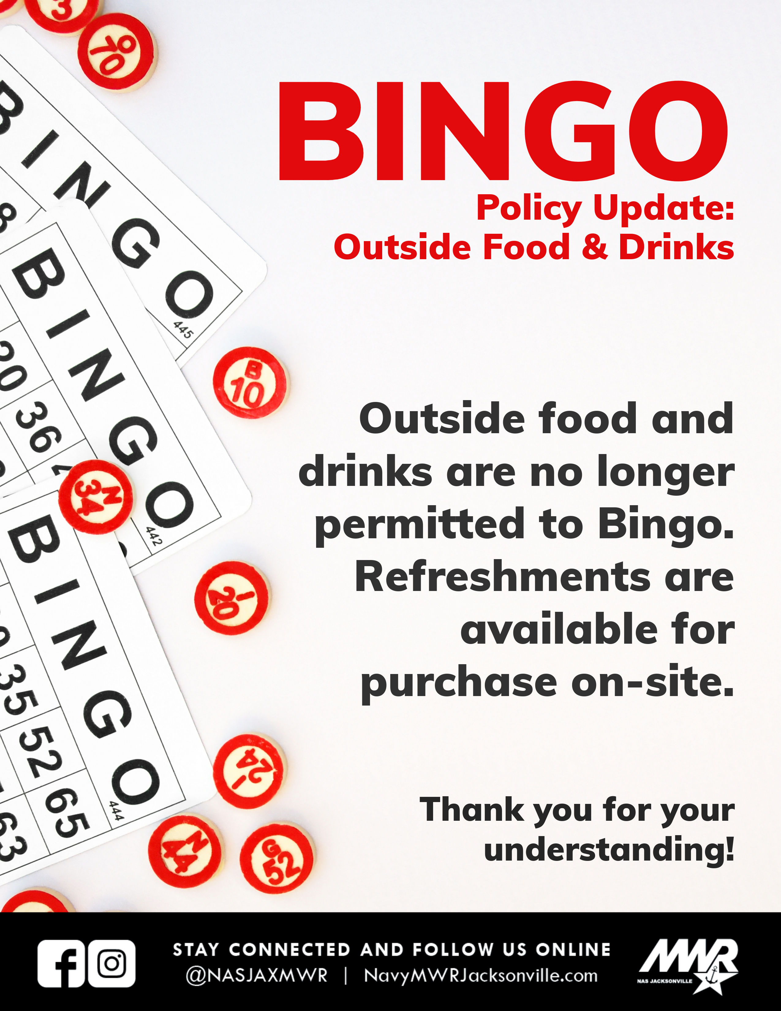 The Bingo Program is held at the River Cove Community Center on Mustin Road, across from the golf course (click here to view the map). Sessions are offered during both weekdays and weekends, with doors opening well in advance of each session to allow time for check-in and seating.